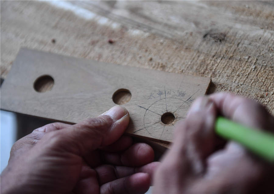 Yu Shengji makes wooden farm tool miniatures in Duchang county, East China's Jiangxi province, Oct 11, 2019. [Photo/Xinhua]
