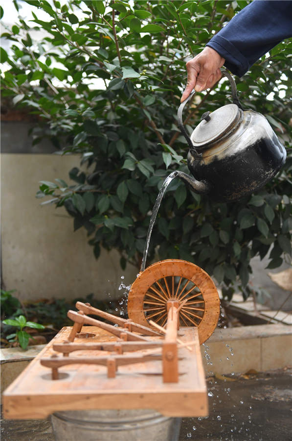 Yu Shengji shows a watermill miniature crafted by him in Duchang county, East China's Jiangxi province, Oct 11, 2019. [Photo/Xinhua]