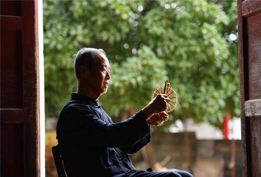 Yu Shengji examines a spinning wheel miniature crafted by him in Duchang county, East China's Jiangxi province, Oct 11, 2019. [Photo/Xinhua]