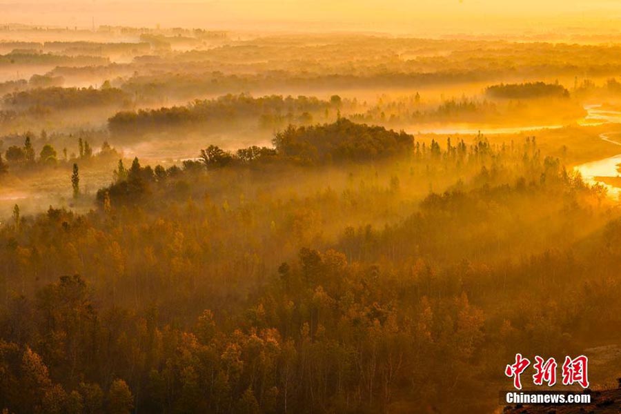 Stunning autumn scenery is pictured in the river valley in Nilka county, Ili Kazak autonomous prefecture, Northwest China's Xinjiang Uygur autonomous region, Oct 10, 2019. [Photo/Chinanews.com]