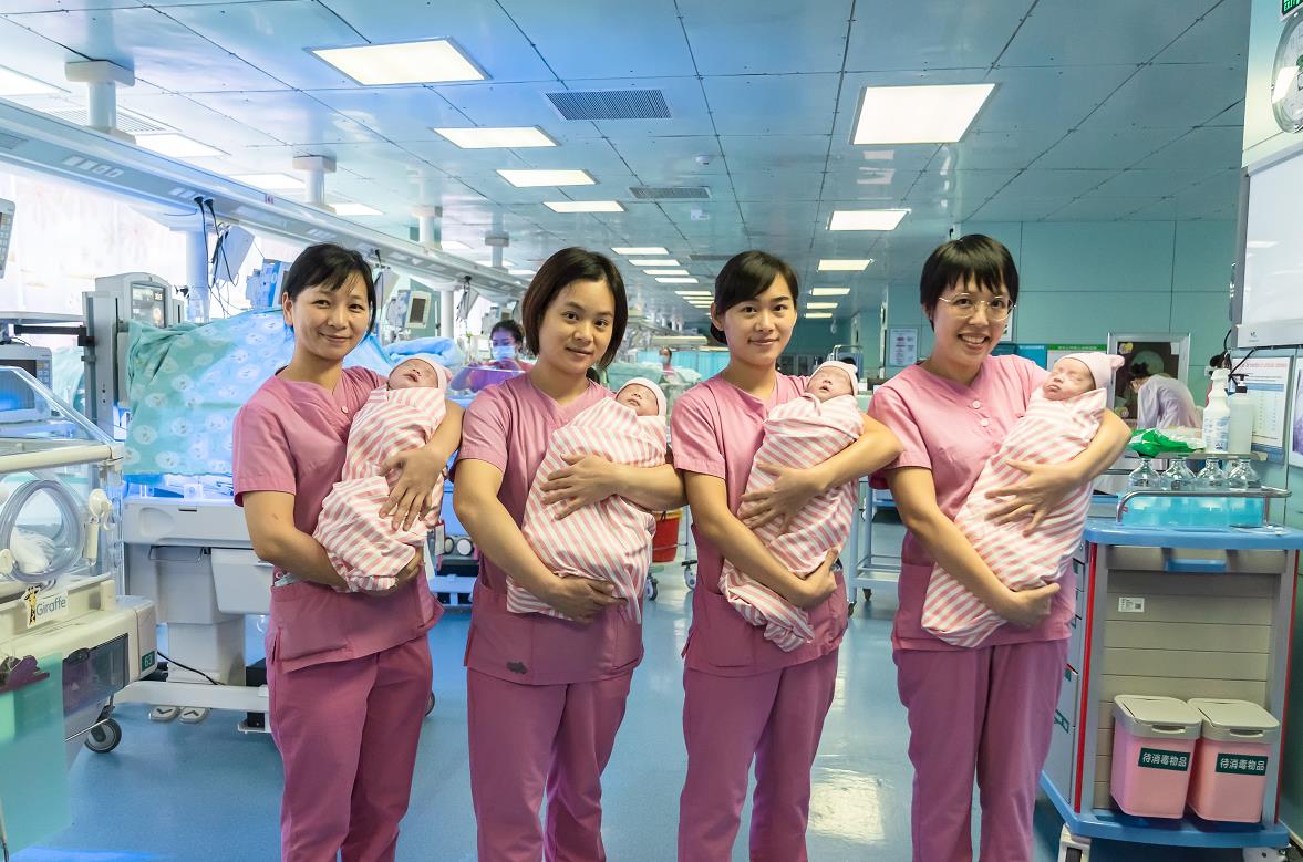 The quadruplets, who weighed 1.99, 1.65, 1.39 and 1.62 kilograms respectively, had to be sent to the natal ICU for treatment when they were born. said Yang Chuanzhong, a senior doctor from the hospital's neonatal department.