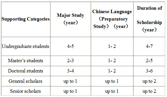 Chinese Government Scholarship covers both major study and Chinese language (preparatory) study. The table below illustrates the duration of each program.