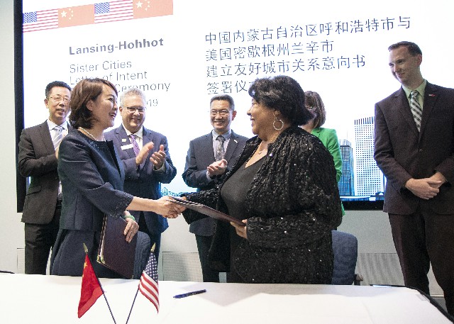 The letter of intent was signed by Li Hong, director of the Foreign Affairs Office of Hohhot, and Barbara Mason, president of the Lansing Regional Sister Cities Commission.