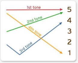 There are four main tones and one neutral tone in mandarin Chinese (or, as some say, five tones). Each tone has a distinctive pitch contour, which can be graphed using the following Chinese 5-level system.