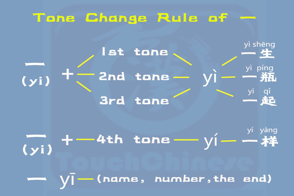 “一” is pronounced in first tone when it`s by itself, at the end of a word, or used as a number. When it is followed by a first tone, second tone, or third tone character though, “一” changes to the fourth tone. It is pronounced in the second tone when it precedes a fourth tone.