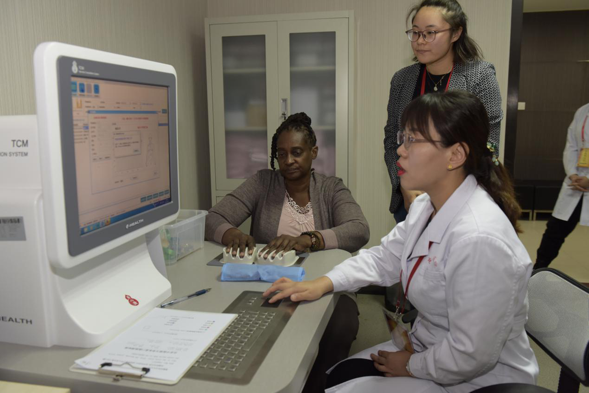 Visitors tried various traditional TCM services at Dongzhimen Hospital, including the four basic medical treatments of Wang(Observation), Wen(Smell), Wen(Enquiry), and Qie(Examination), acupuncture, cupping jar therapy and herb tea, as well as programs integrated with modern technologies.