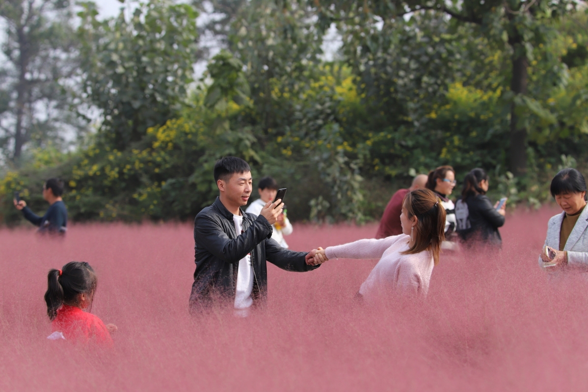 Two young people take photos in the pink field of hairawn muhly in Henanzhuang village, Central China’s Henan province. [Photo by Gong Weidong for chinadaily.com.cn]