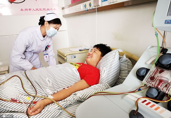 A nurse tends a stem cell donator at a hospital in Taizhou, Jiangsu province, Sept 25, 2019. [Photo/IC]