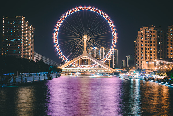 Tianjin Eye, also known as the Tientsin Eye, is a ferris wheel built on a bridge over the Haihe River. The Tianjin Eye was completed in 2008. It is 120 meters tall and has become one of the landmarks of Tianjin. It is the only ferris wheel built above a bridge. One can ride it to get a bird's-eye view of Tianjin or simply appreciate it from afar from the Jingang Bridge, about 800 meters away to the south.