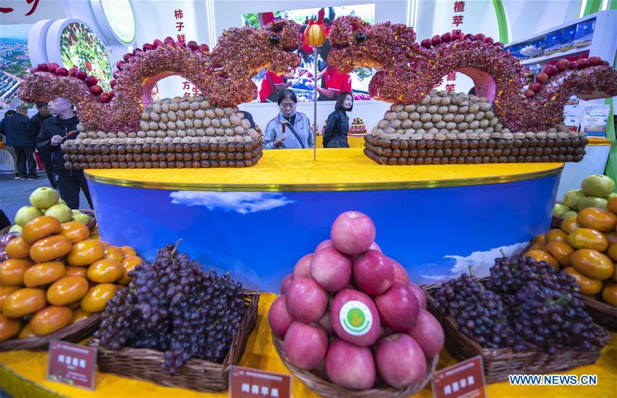 People visit the fourth Shanxi (Yuncheng) International Fruit Trade Expo in Yuncheng, north China's Shanxi Province, Oct. 21, 2019. Opening Monday in Yuncheng, the trade expo attracts visitors with some 850 types of fruit, dried or fresh, as well as processed fruit products. (Xinhua/Yang Chenguang)