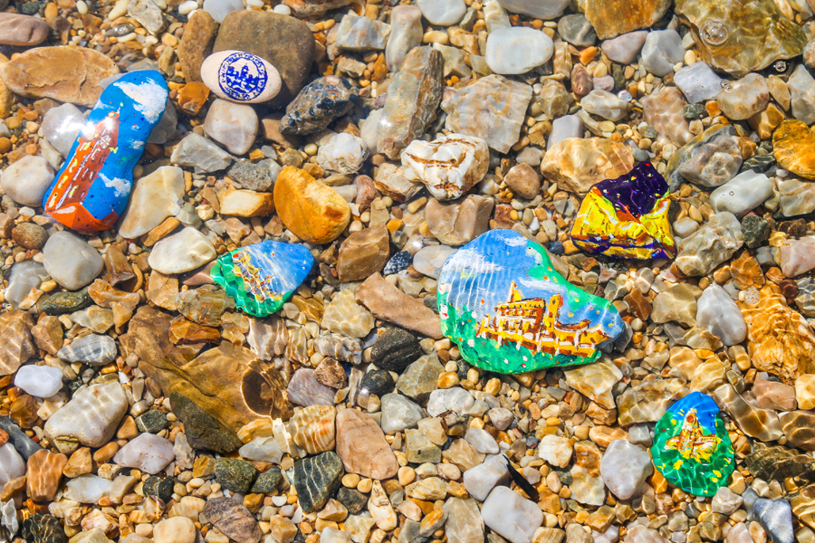 A senior student at Dalian Neusoft University of Information painted the pictures on stones with propylene to express her wishes to the campus, coastal city and motherland. [Photo provided to chinadaily.com.cn]