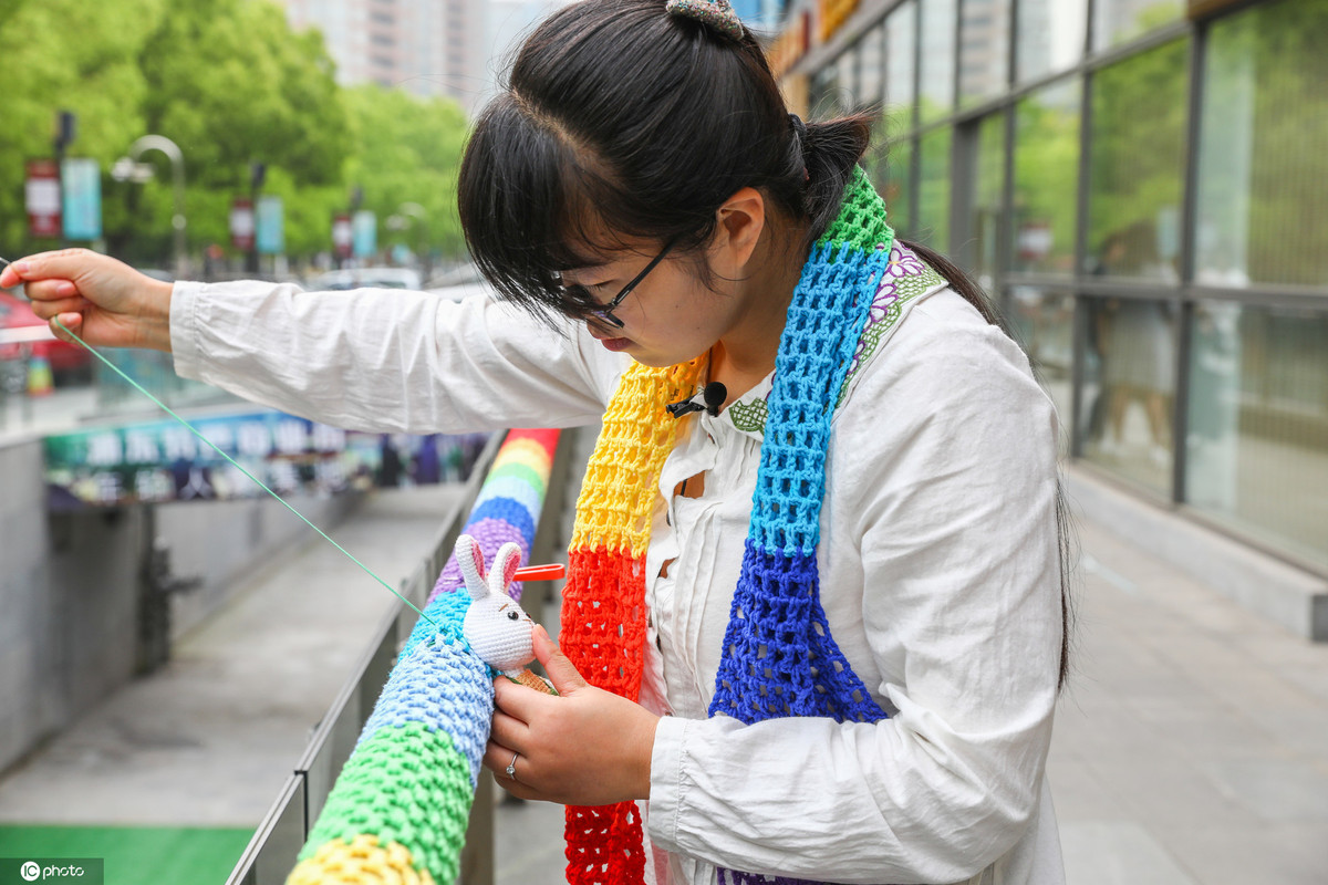 At the end of last year, Mao copied the idea of "woven graffiti" from her overseas counterparts to attract more attention to the mental health issues behind the women's weaving works. Mao and her group crocheted the 500-meter-long iron railing covers in Jinxiufang with colorful wool and dolls.