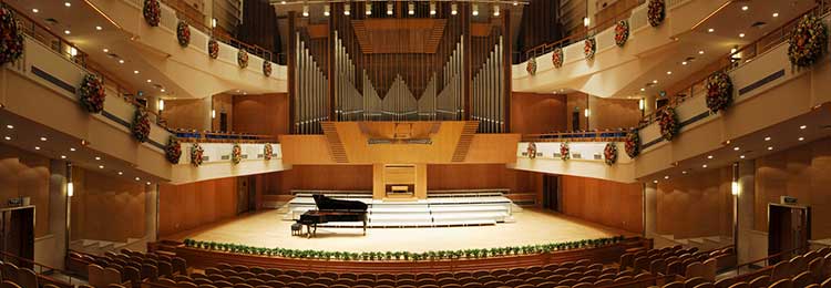 Hanging below the stage ceiling are 16 acoustic panels, ensuring the highest fidelity of sound in every corner of the auditorium. With modern architectural acoustic measures in interior design that produce good frequency responses, moderate reverberation time, and uniform sound field distribution, the concert hall is an ideal space for professional performances and live recording. A number of record companies have made their albums there for worldwide release.