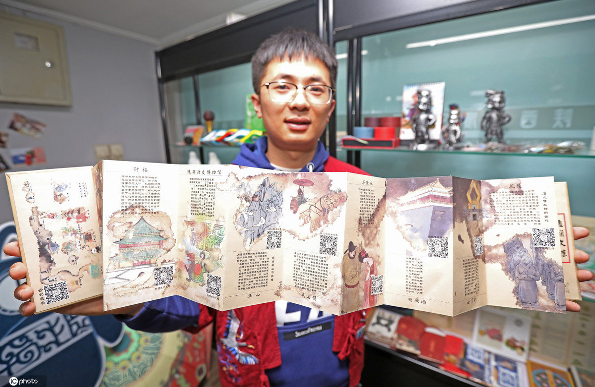 Wang Mingde shows a travel strategy map with the distinctive local features of Northwest China's Shaanxi province, Oct 17, 2019. [Photo/IC]