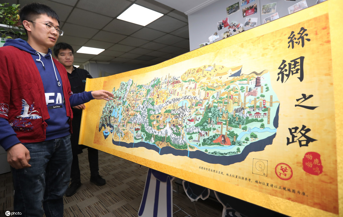 Wang Mingde shows a cultural map themed around the ancient silk road, Oct 17, 2019. [Photo/IC]
