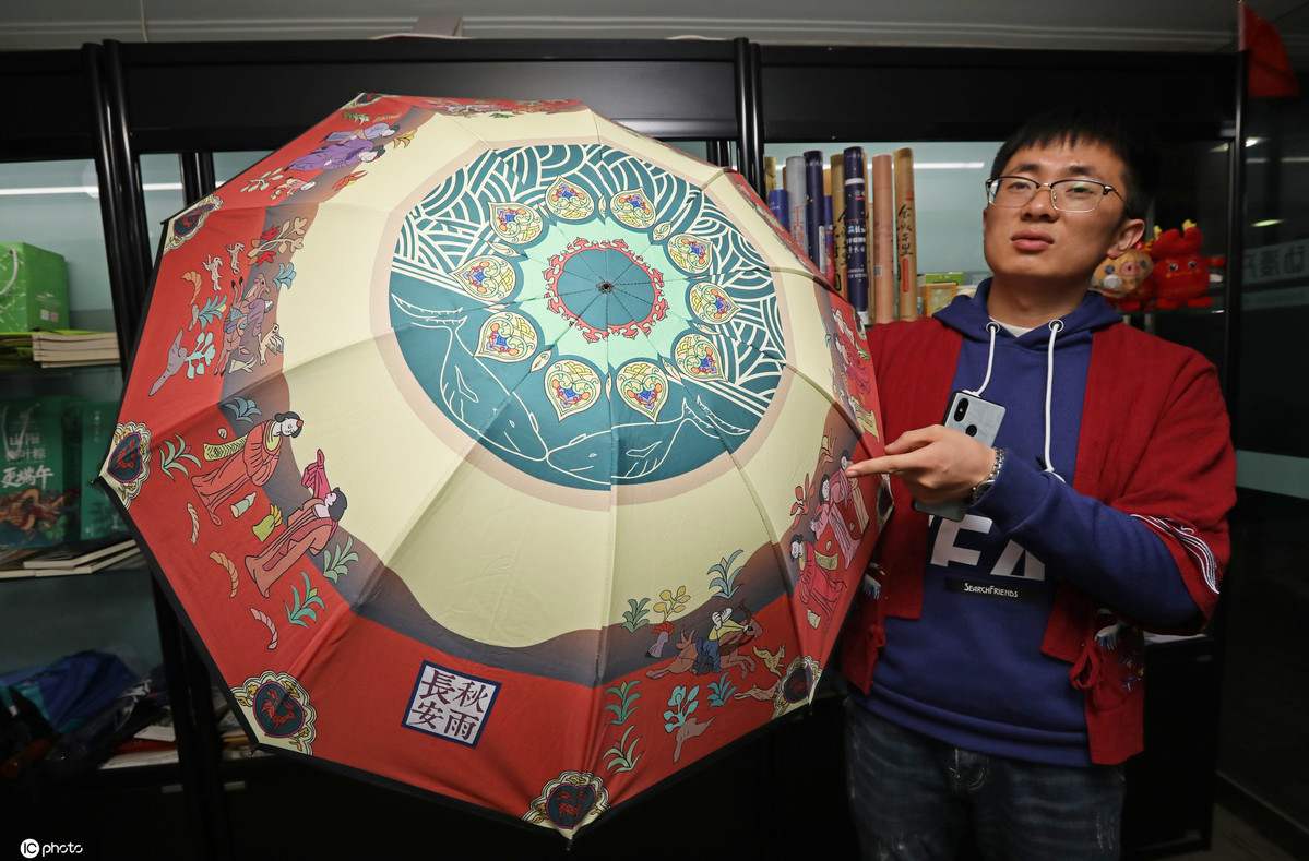 Wang Mingde unfolds an umbrella decorated with traditional Chinese imagery, Oct 17, 2019. [Photo/IC]