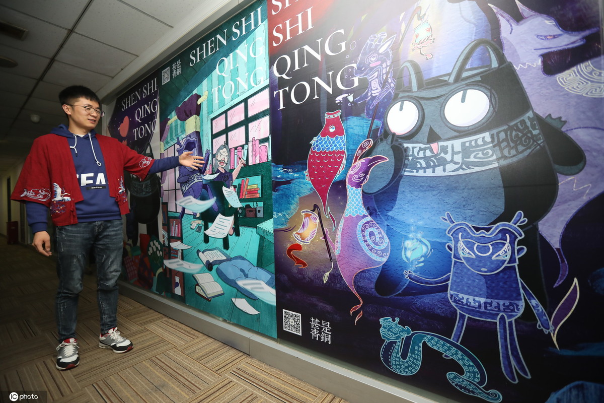 Wang Mingde describes the paintings on the walls of his company's office, Oct 17, 2019. [Photo/IC]