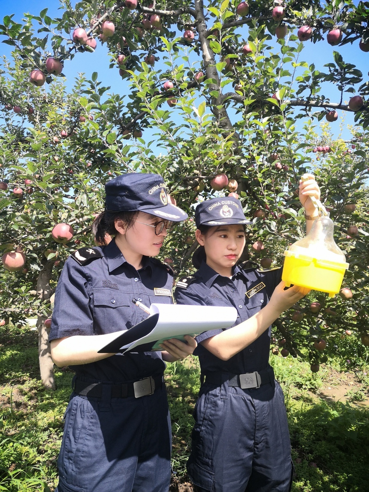 Lanzhou Customs staff checks the traps at the apple base.[Photo provided to chinadaily.com.cn]