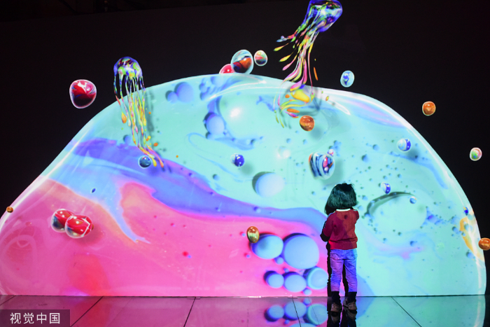A girl interacts with an art piece at a theme exhibition. [Photo/VCG]