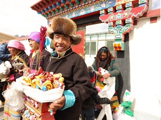 Villagers offer chemar - a mixture of roast barley flour and butter – and barley wine to celebrate moving into their new homes. [Photo provided to chinadaily.com.cn]