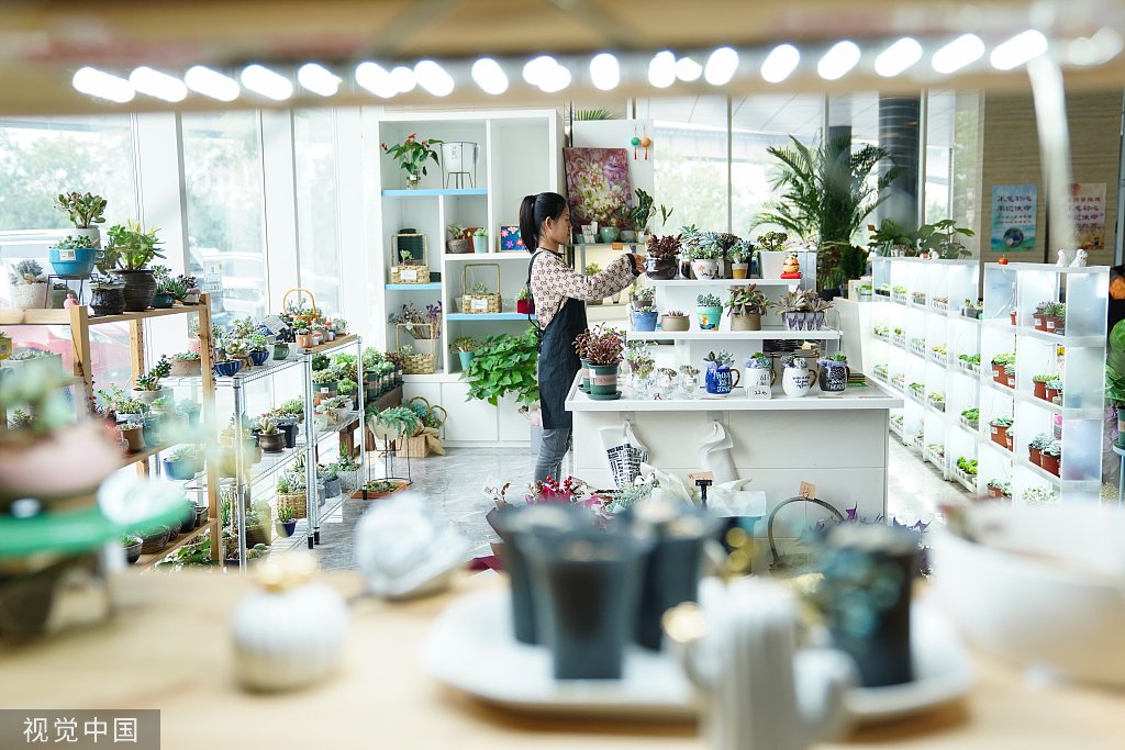 Wang Shuangqing, a staff member, tends to the store's succulent plants in Tianjin, Oct 18, 2019. [Photo/VCG]