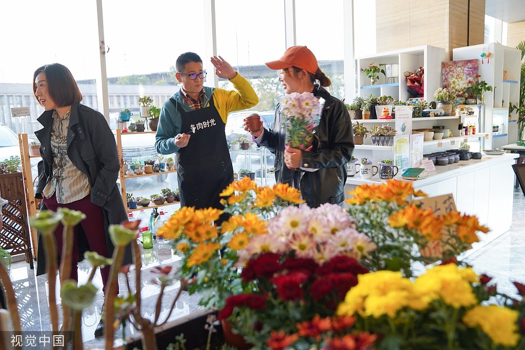 Feng Jinliang, a staff member at the store, communicates with customers in sign language in Tianjin, Oct 21, 2019. [Photo/VCG]