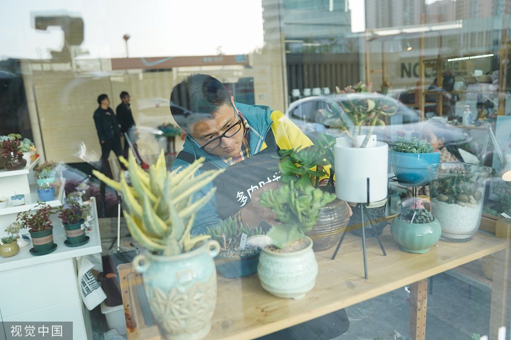 Feng Jinliang, a staff member, as well as the sign language teacher at the store, tends to the succulent plants, Oct 21, 2019. [Photo/VCG]
