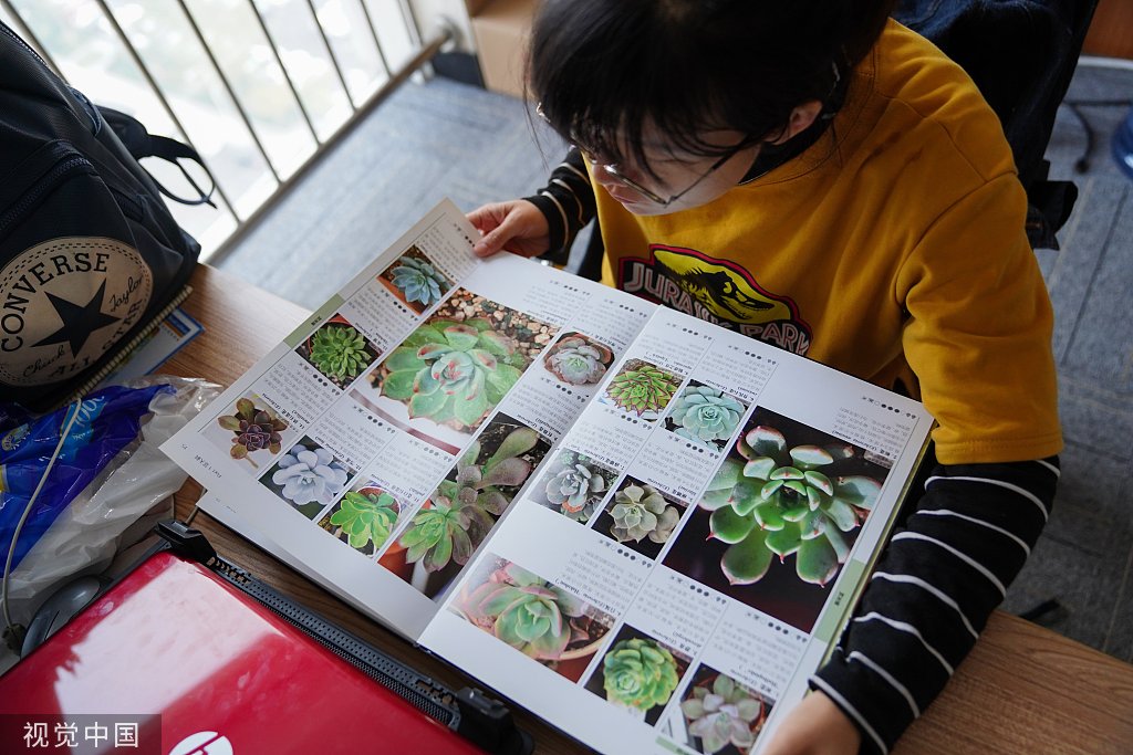 Staffer Cong Ying takes a look at an illustrated handbook about succulents after work, Oct 18, 2019. [Photo/VCG]