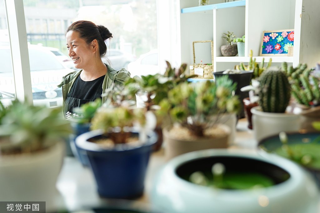 Dong Miaoqiang, who set up the store in Tianjin, surrounded by a variety of the succulent plants, Oct 18, 2019. [Photo/VCG]
