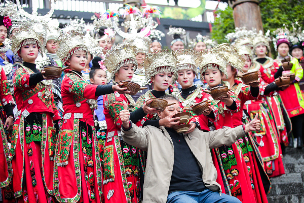 Dressed in colorful ethnic clothing, Miao young women greet a male visitor with the traditional high mountain and flowing water toast, Oct 26, 2019. [Photo provided to chinadaily.com.cn]