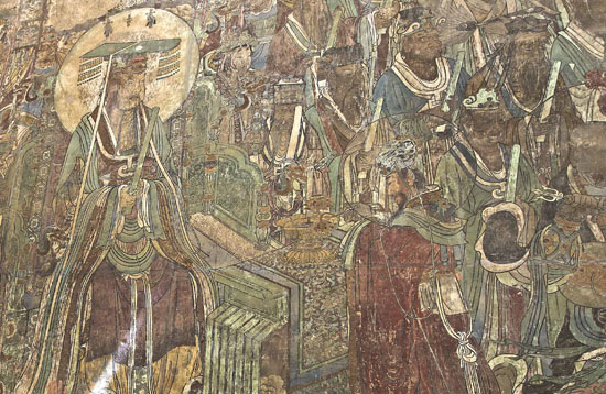 Among numerous mural paintings in the palace, the paintings of Heavenly Court (Chaoyuan tu), known as "Oriental Gallery," is the best known. Measuring 97 meters long and 4.4 meters high, it features 290 Taoist figures.