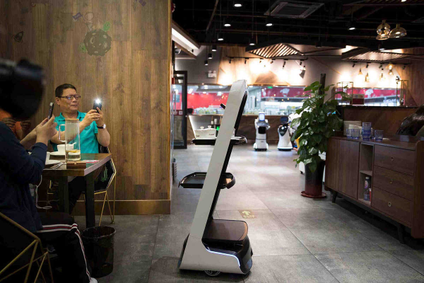 Robots serving food in a restaurant in Binhai New Area. [Photo/People's Daily Online]