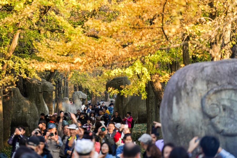 Bursts of late autumn color are seen in this aerial shot taken on Nov 5, 2019 of Shixiang Road near the Ming Xiaoling Mausoleum, a famed attraction in Nanjing city, East China's Jiangsu province. [Photo/Xinhua]