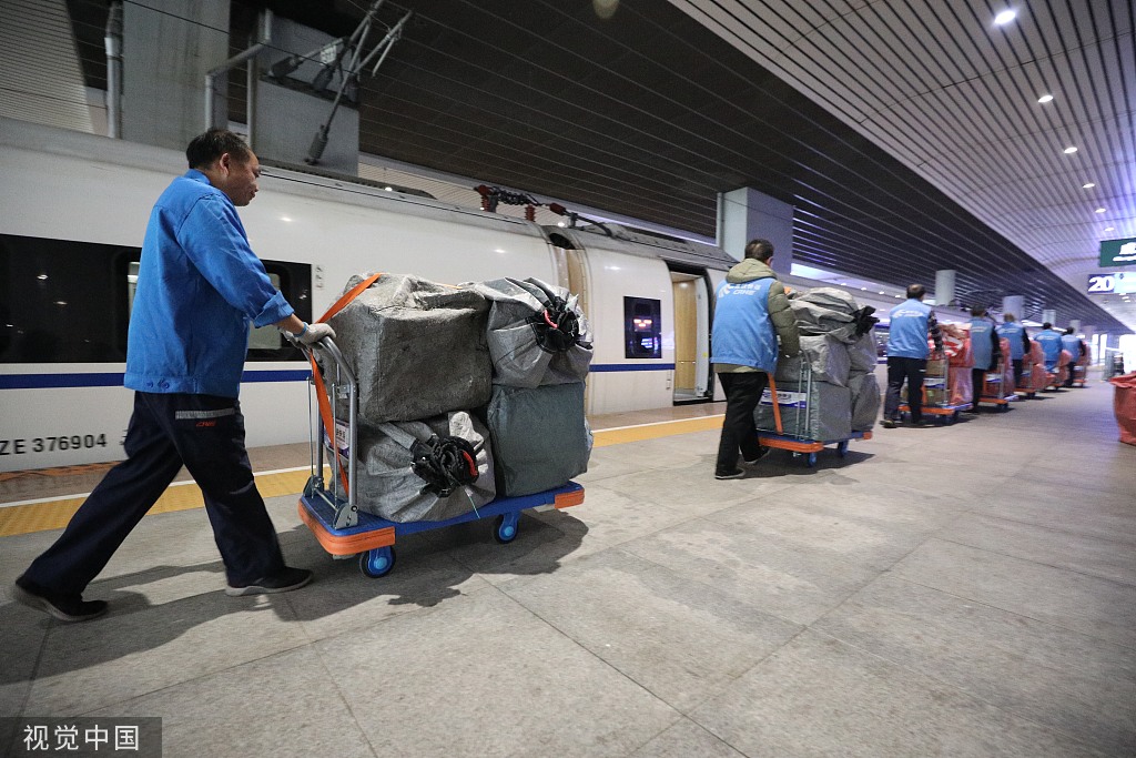 Staff members unload the goods from a high-speed train in Chengdu, Southwest China's Sichuan province. Some 120,000 kinds of products were newly imported to China on the Tmall International platform and the growth rate hit 300 percent for those brands entering China for the first time. [Photo/VCG]