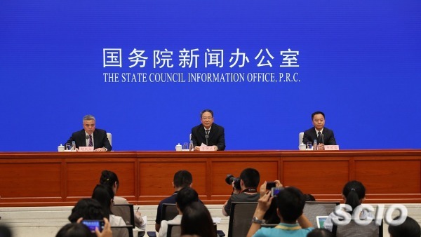 During the Anhui session held Aug 14 in Beijing, Li Jinbin (center), secretary of the CPC Anhui Provincial Committee, and Li Guoying (right), governor of Anhui Provincial People's Government, talk about the province’s achievements over the past 70 years. [Photo/scio.gov.cn]