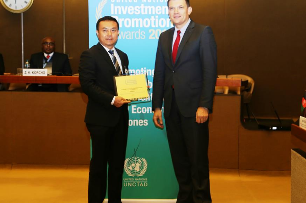 The representative of Guangzhou Development District (GDD) received the award from the United Nations in Geneva on Monday for its excellence in promoting sustainable investment.