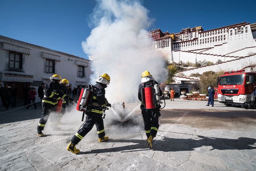 Firefighters take part in a firefighting sports meeting at the Potala Palace in Lhasa, Tibet autonomous region, on Nov 13, 2019. [Photo/China News Service]