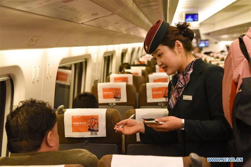 A stewardess checks tickets for passengers on high-speed train D8804 from Urumqi to Hami in Northwest China's Xinjiang Uygur autonomous region, Nov 16, 2019. Last Sunday marks the fifth year of the operations of the first high-speed rail link in Xinjiang that has carried 30.75 million passengers. At present, the trains make 43 round trips per day in Xinjiang section of Lanxin high-speed railway. [Photo/Xinhua]
