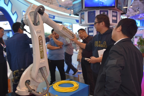 A mechanical arm attracts much attention at the Qingdao fair. [Photo provided to chinadaily.com.cn]