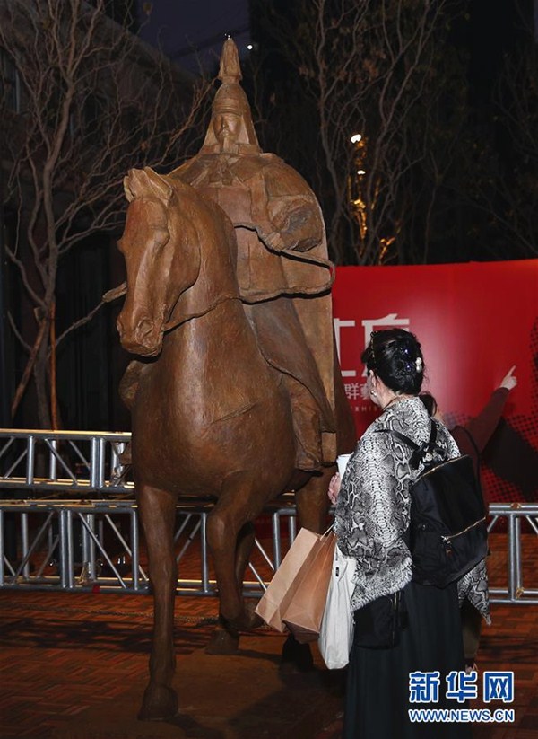 A giant sculpture of a man on a horse is photographed at the exhibition in Shenyang. [Photo by Long Lei/Xinhua]