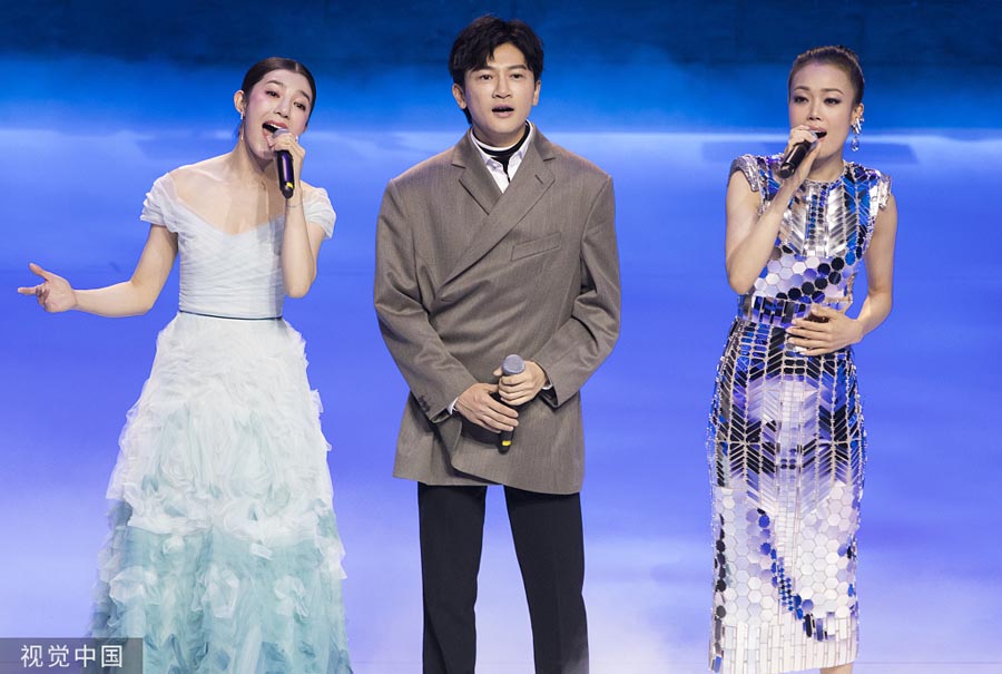 Singer and actor Alec Su (center) and Joey Yung (right) perform at the opening of the 28th Golden Rooster and Hundred Flowers Film Festival, Nov 19, 2019. [Photo/VCG]