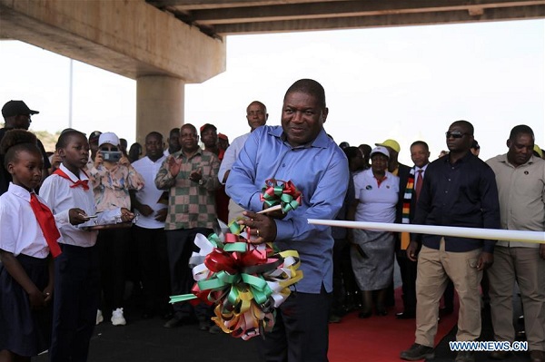 Mozambican President Filipe Nyusi cuts the ribbon at the opening ceremony of the N6 Road in Manica province, central Mozambique, Nov. 14, 2019. The newly rehabilitated and upgraded N6 Road in central Mozambique is a determining factor for the regional economy and will contribute to the socio-economic development of the country, said Mozambican President Filipe Nyusi on Nov.14. Nyusi made that remark when addressing the opening ceremony of the N6 Road in Inchope of the central province of Manica. Also known as "Beira Corridor," the N6 Road traverses two provinces and connects Machipanda at the western border area and the Beira port to the east, shortening the two points' driving time from seven hours to four. (Xinhua/Nie Zuguo)