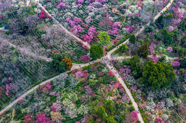The scenic area covers more than 102 hectares of plum blossoms on about 400 kinds of plum trees.