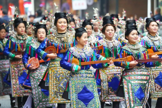 Dong girls play traditional musical instruments happily for the "Dong year". [Photo provided to chinadaily.com.cn]