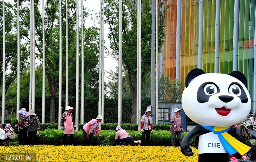 Workers prepare the flowerbed by the National Exhibition and Convention Center in Shanghai, the venue for the second China International Import Expo, on Oct 22, 2019. [Photo/VCG]