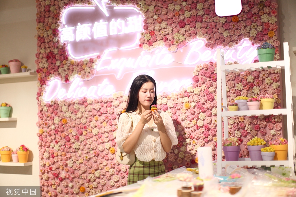 A visitor tastes a flowerpot-shaped cupcake at the Taobao Maker Festival in Hangzhou, East China's Zhejiang province, on Sept 14, 2019. [Photo/VCG]