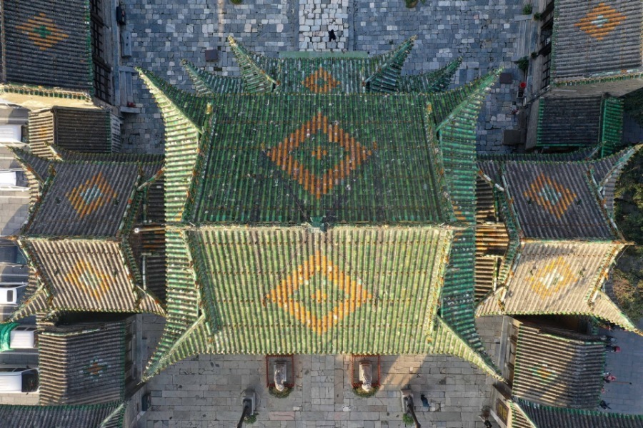 Aerial photo taken on Nov 25, 2019 shows the Shan-Shaan Guildhall architectural complex in Shedian town of Sheqi county, Central China's Henan province. The Shan-Shaan Guildhall was co-built by merchants from Shanxi and Shaanxi provinces who then lived in Sheqi county in the Qing Dynasty (1644-1911) in Shedian, a famous commercial township during the ancient Ming and Qing dynasties.[Photo/Xinhua]