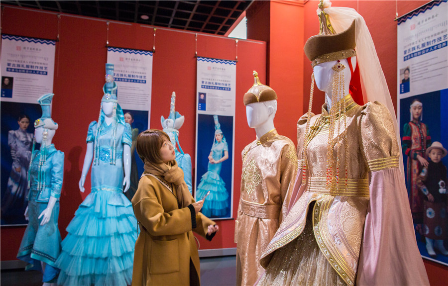 A visitor views costumes on show at the Inner Mongolia Art Museum in Hohhot, North China's Inner Mongolia autonomous region, on Nov 26, 2019. [Photo by Ding Genhou/Asianewsphoto]