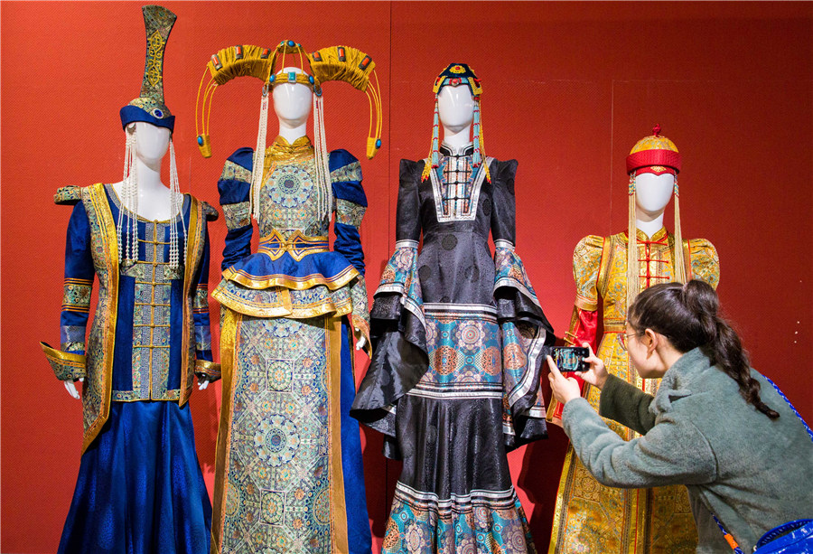 A visitor takes a photo of the costumes on show at the Inner Mongolia Art Museum in Hohhot, North China's Inner Mongolia autonomous region, on Nov 26, 2019. [Photo by Ding Genhou/Asianewsphoto]