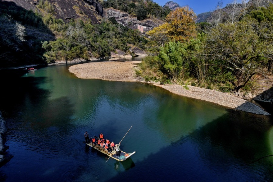 Tourists take bamboo rafts on the Jiuqu River at Wuyi Mountain scenic area, Southeast China's Fujian province. Wuyi Mountain was accepted as a cultural and natural heritage protection site by the UNESCO in 1999. [Photo/Xinhua]